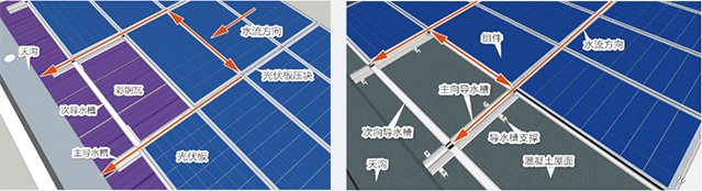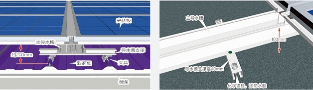 芯屋頂 BIPV 系統結構縱橫方向分別由主導水槽與次導水槽組成,下雨時,雨水流過光伏板并沿主次導水槽排向天溝,實現雙倍防水效果。